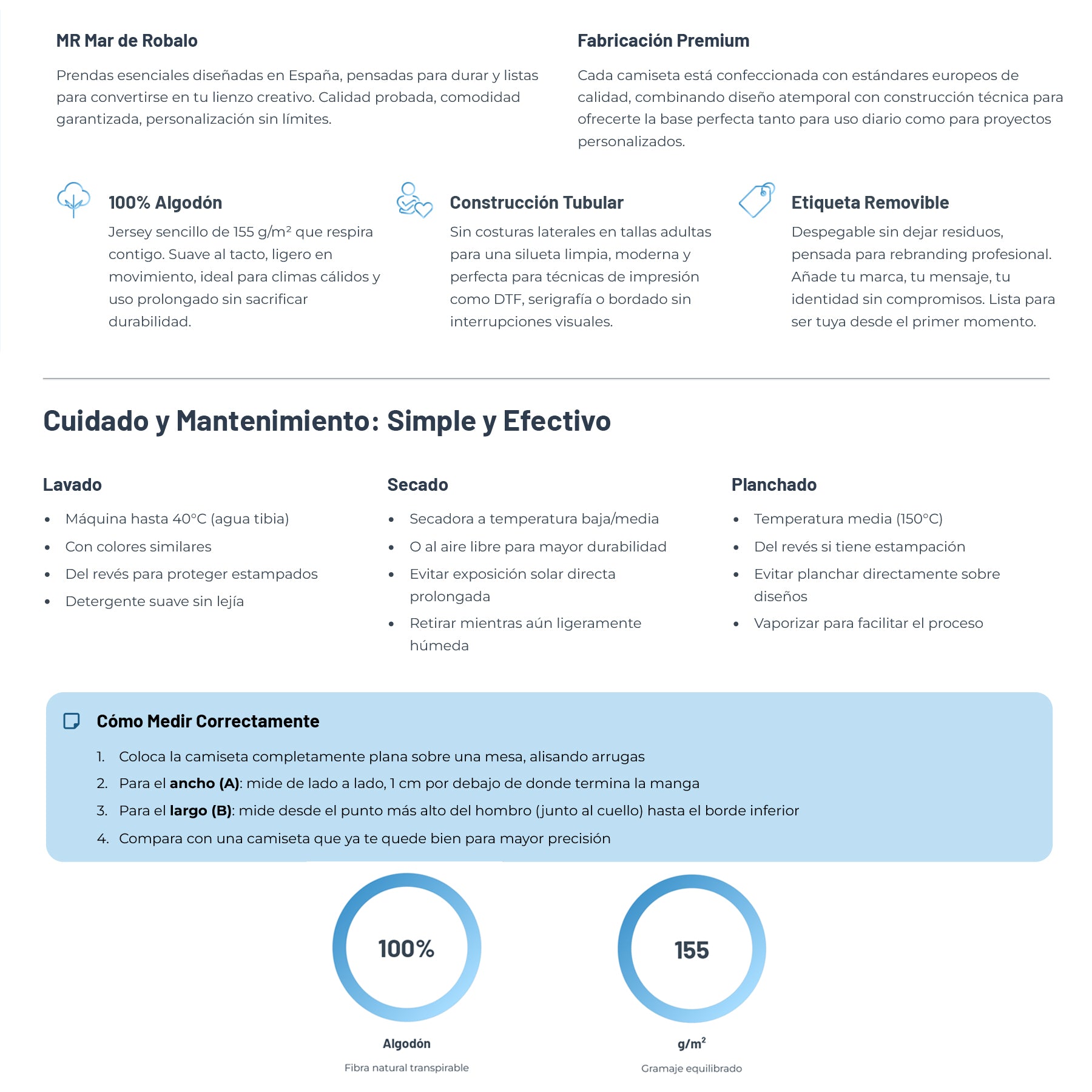 Camiseta básica premium de manga corta diseñada en España por MR Mar de Robalo, perfecta para diario, eventos o para crear tu merch con un acabado profesional. Confeccionada en 100% algodón de punto liso 155 g/m², incorpora cuello redondo doble con elastano para mantener la forma lavado tras lavado y cubrecosturas reforzado en el cuello para mayor comodidad. En tallas de adulto presenta corte tubular (sin costuras laterales), ideal para personalización, y etiqueta removible para un look limpio de marca.